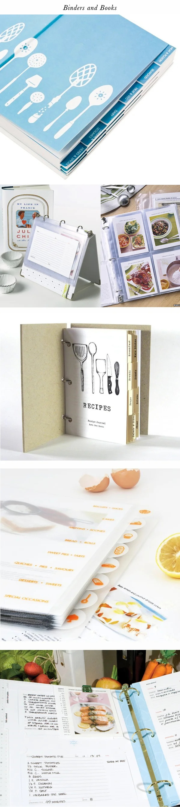 Image sources: Binders and Books 1-kikki k, 2-liba style, 3-martha stewart, 4-bethbee etsy shop, 5-kikki k, 6-russell + hazel; Recipe Boxes 1-1canoe2 etsy shop, 2-container store, 3-macy's, 4-sincerely yours paper; Recipe Cards 1-claybrook print design etsy shop, 2-earmark etsy shop, 3-ladybugpress etsy shop